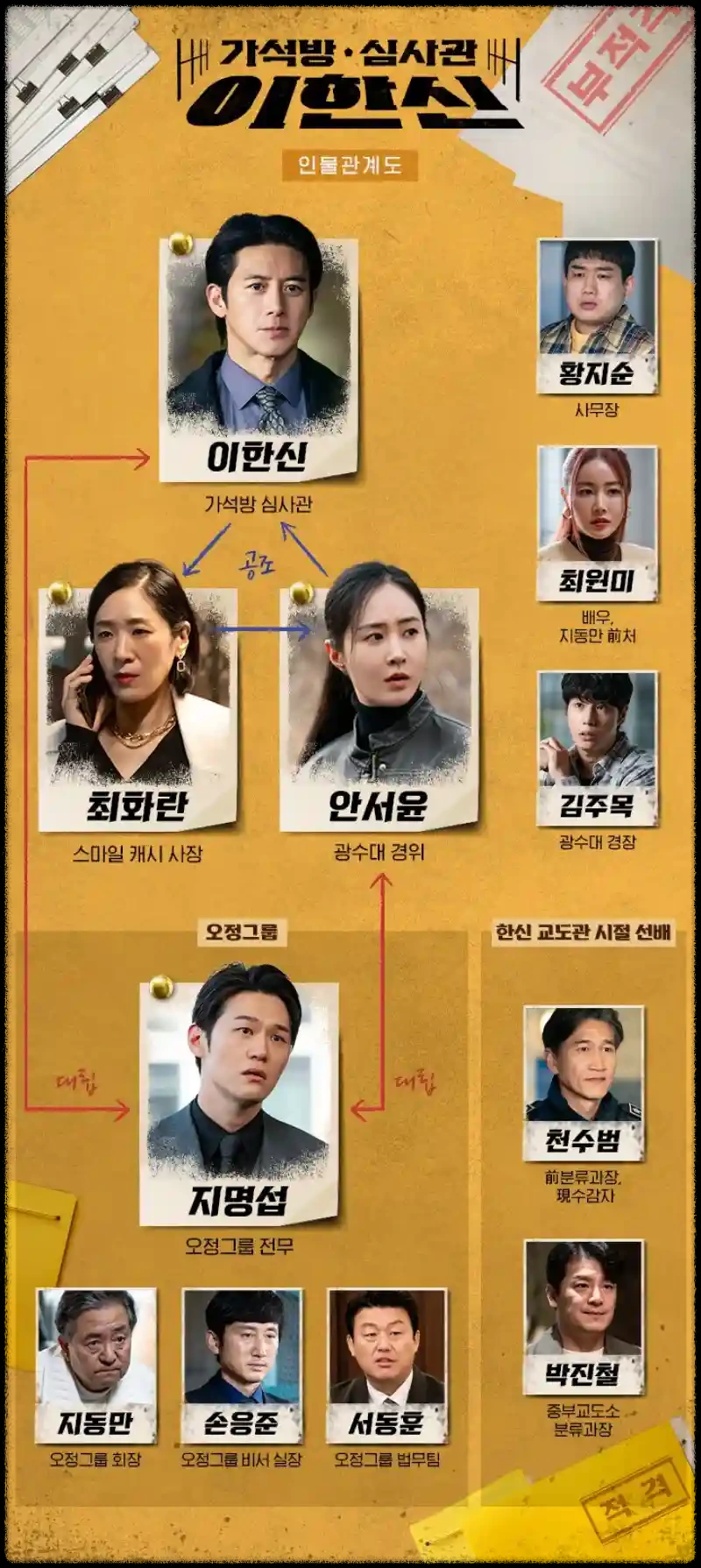 주요 등장인물로는 이한신 외에도 황지순, 최화란, 안서윤, 지명섭 등이 있습니다. 이한신은 공권력에 대한 불신을 겪으며 가석방 심사관이 되기로 결심한 인물로, 극의 중심을 이끌어갑니다. 황지순은 이한신의 동료로서, 그와 함께 가석방 심사에 참여하며 다양한 사건을 해결해 나갑니다. 최화란은 이한신의 과거와 연결된 인물로, 그들의 관계는 드라마의 중요한 축을 이룹니다.