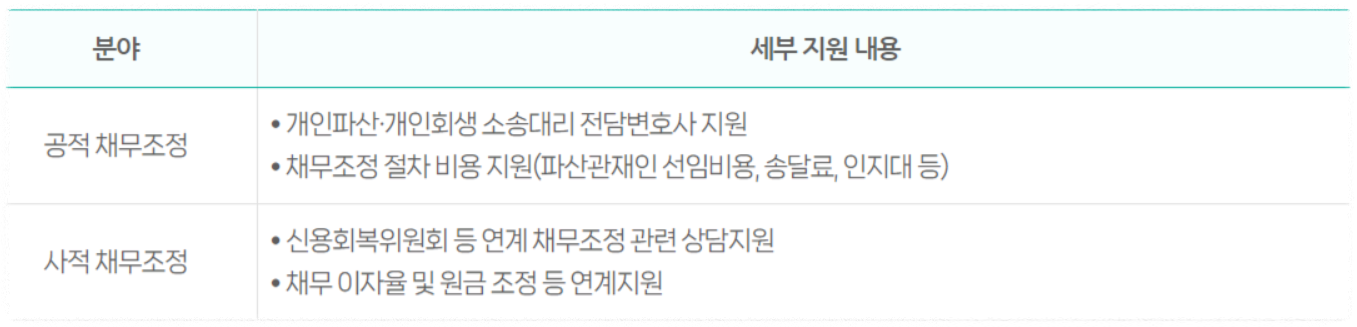 - 공적 채무조정: 개인파산 개인회생 소송 대리 및 비용 지원 (송달료, 인지대, 파산관재인 선임비용 등 포함)