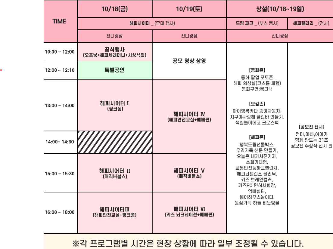저출생 문제 극복과 가족의 행복을 주제로 한 특별한 행사입니다. 이 축제의 가장 큰 메리트는 가족 단위로 즐길 수 있는 다양한 프로그램, 특히 아이가 중점인 축제입니다. 아이들이 즐길 수 있는 놀이와 체험 프로그램이 풍성하게 준비되어 있으며, 핑크퐁 댄스파티, 매직버블쇼와 같은 공연부터 안전 교육까지 가족 모두가 함께 참여할 수 있는 활동이 마련되어 있습니다.